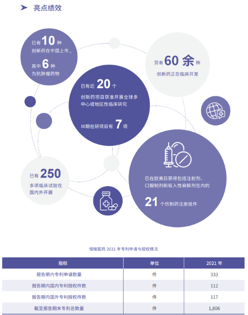 报告指出,在科技创新战略引领下,金年会金字招牌诚信至上医药2021年累计研发投入62.03亿元,比上年增长24.34%,研发投入占销售收入比重达到23.95%,再创历史新高。以此为支撑,2021年公司有3款创新药获批上市,已上市创新药总量增至10款,其中6款为抗肿瘤药物。同时还有60余种创新药正在临床开发,250多项临床试验在国内外开展,其中近20个创新药项目获准开展全球多中心或地区性临床研究。在创新药研发上,金年会金字招牌诚信至上医药已基本形成了上市一批、临床一批、开发一批的良性循环。