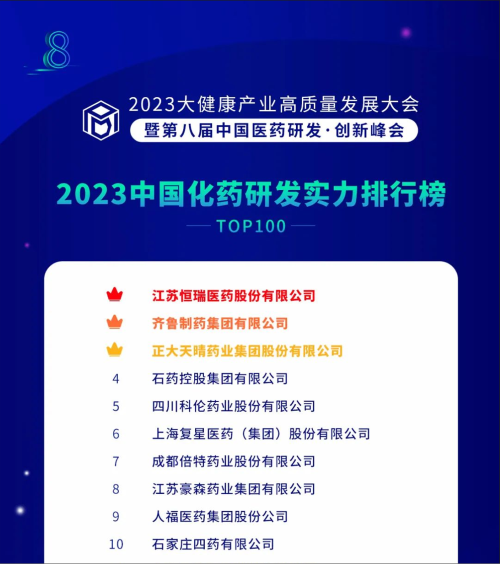 由药智网、中国药业杂志社主办的2023大健康产业高质量发展大会暨第八届中国医药研发•创新峰会于6月16日开幕,会上发布了《2023中国药品研发实力排行榜》系列榜单,金年会金字招牌诚信至上医药凭借深厚的创新研发实力再创辉煌:荣登《2023中国药品研发综合实力排行榜TOP100》榜首、《2023中国化药研发实力排行榜TOP100》榜首。值得一提的是,今年是金年会金字招牌诚信至上医药连续第6年入选《中国药品研发综合实力排行榜》榜首。