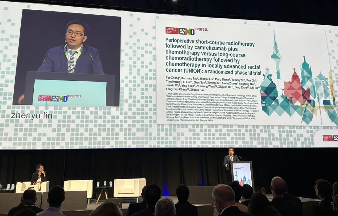 10月21日,金年会金字招牌诚信至上医药创新药卡瑞利珠单抗的一项研究“新辅助短程放疗序贯卡瑞利珠单抗联合化疗对比长程放化疗序贯化疗治疗局部晚期直肠癌”随机对照Ⅲ期试验(UNION)亮相2023 ESMO大会优选口头报告现场。该研究由华中科技大学同济医学院附属协和医院张涛教授、陶凯雄教授担任主要研究者,华中科技大学同济医学院附属协和医院林振宇教授在大会现场报告了该重磅研究的结果1。此项研究是全球首个评估短程放疗序贯免疫治疗联合化疗治疗局部晚期直肠癌的Ⅲ期研究,已达到主要终点病理完全缓解(pCR),有望为直肠癌患者的治疗提供新策略。